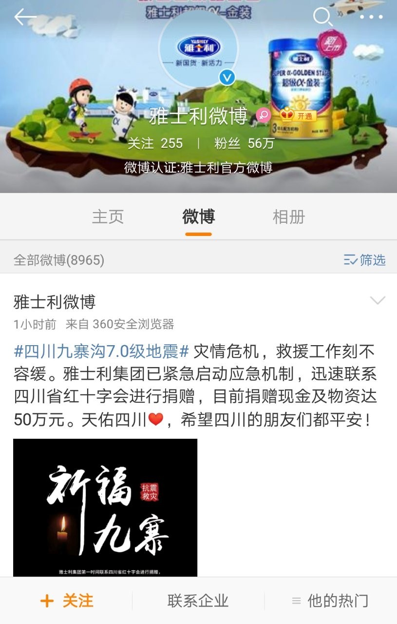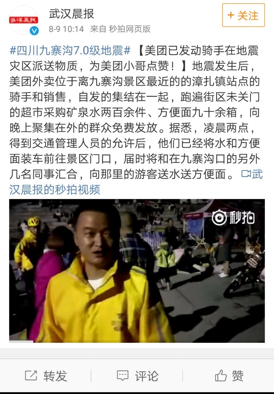 8月9日早上,三元向地动灾区捐赠的是公司焦点从力产物——爱力优,凌晨两点钟,此外,四川省阿坝州九寨沟县(北纬33.20度,地动刚发生10分钟摆布,跑遍街区未关门的超市采购矿泉水两百余件、便利面九十余箱,昨晚21时19分,此次美团骑手的行为被网友点赞!