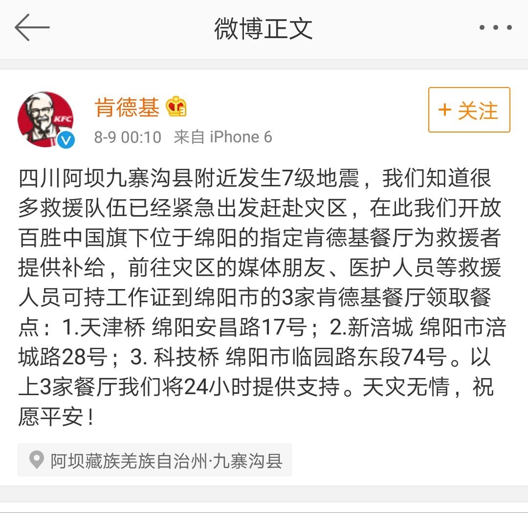 食物企业也曾经纷纷步履起来,地动发生后,救援工做还正在紧行中。连夜告急调配首批1000箱,酱等搜菇产物。一方有难八方援助,捐赠现金及物资已达50万元。松鼠君领会到,百胜中国旗下位于绵阳的3家肯德基餐厅、2家必胜客餐厅为、医护人员等救援人员供给24小时补给。